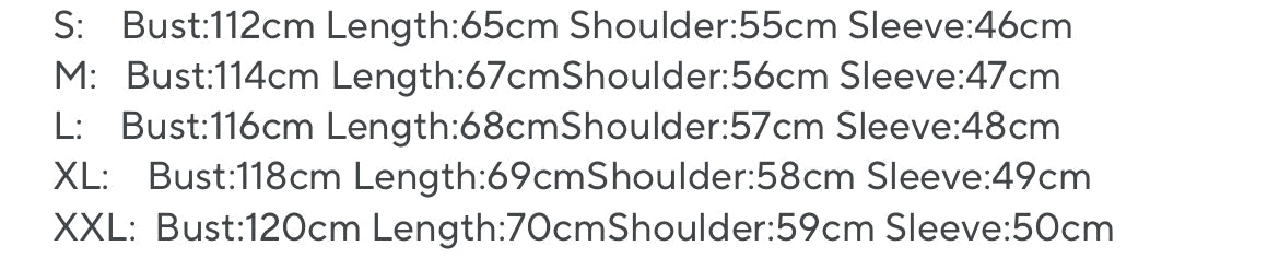 M: Shoulder:61cm Bust:122cm Length:69cm Sleeve:55cm