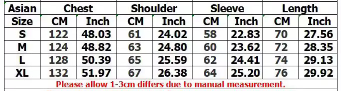 XL: Shoulder:65cm Bust:130cm Length:72cm Sleeve:57cm