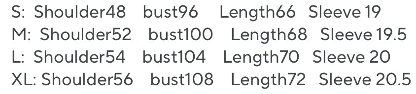 S: Shoulder:58cm Bust:118cm Length:62cm Sleeve:42cm