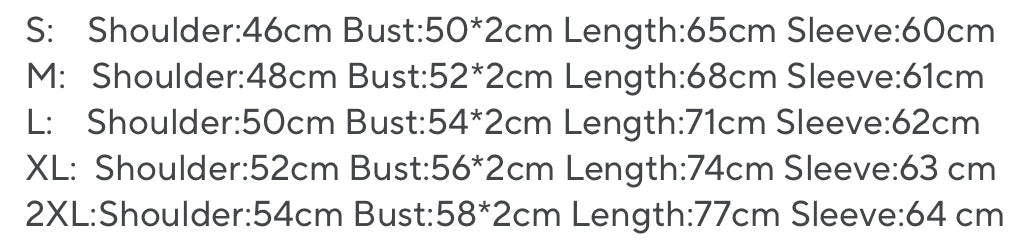 2XL: Shoulder:64cm Bust:134cm Length:70cm Sleeve:50 cm